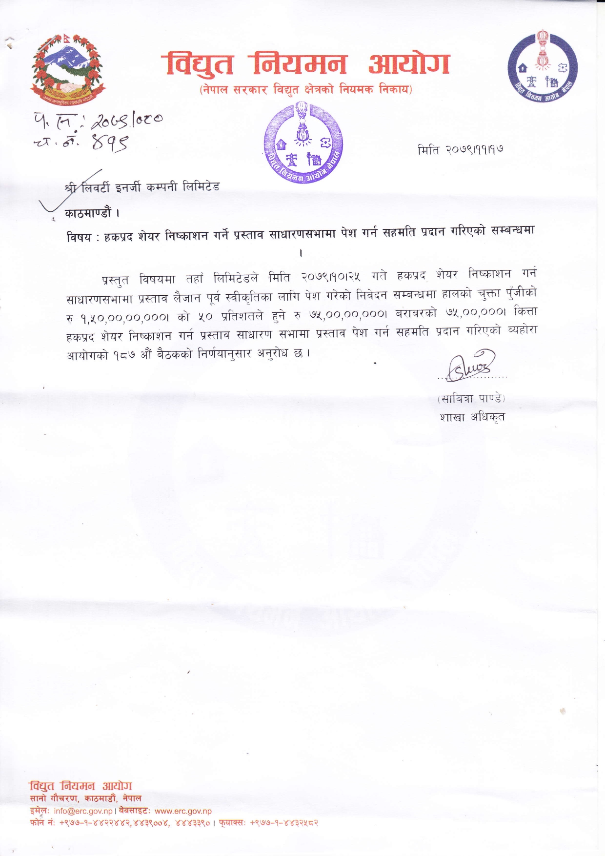 Electricity Regulatory Commission (ERC) has given consent to company to submit proposal of issuing 2:1 right share in upcoming AGM of Company.